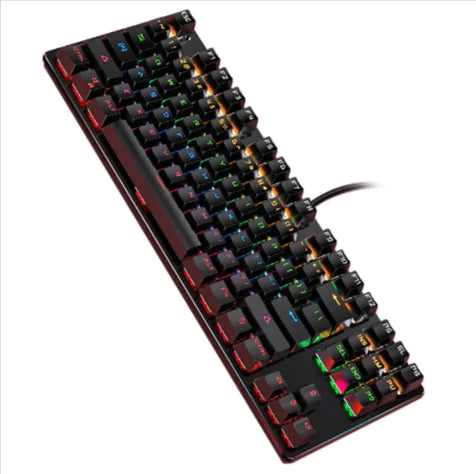 Compact USB mechanical keyboard with plug-and-play support. Features responsive black axis switches, RGB backlighting, and multimedia keys. Ergonomic design without hand rest, built for durability and gaming comfort. Available in bold color combos for a stylish desktop setup.